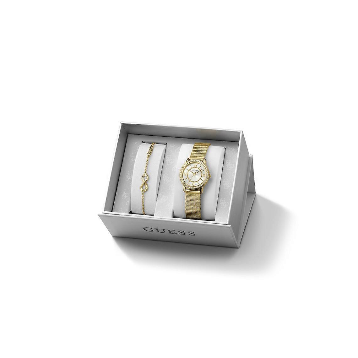 Type: Montre/ Coffret Marque: Guess Montres Genre: Femme Styles: Mode Age: Adulte Couleur du bracelet: Doré Mouvement: Quartz Matière Bracelet: Acier Affichage: Analogique Etanchéité: 30 m (3ATM) Matière Boitier: Acier Forme de Boitier: Rond