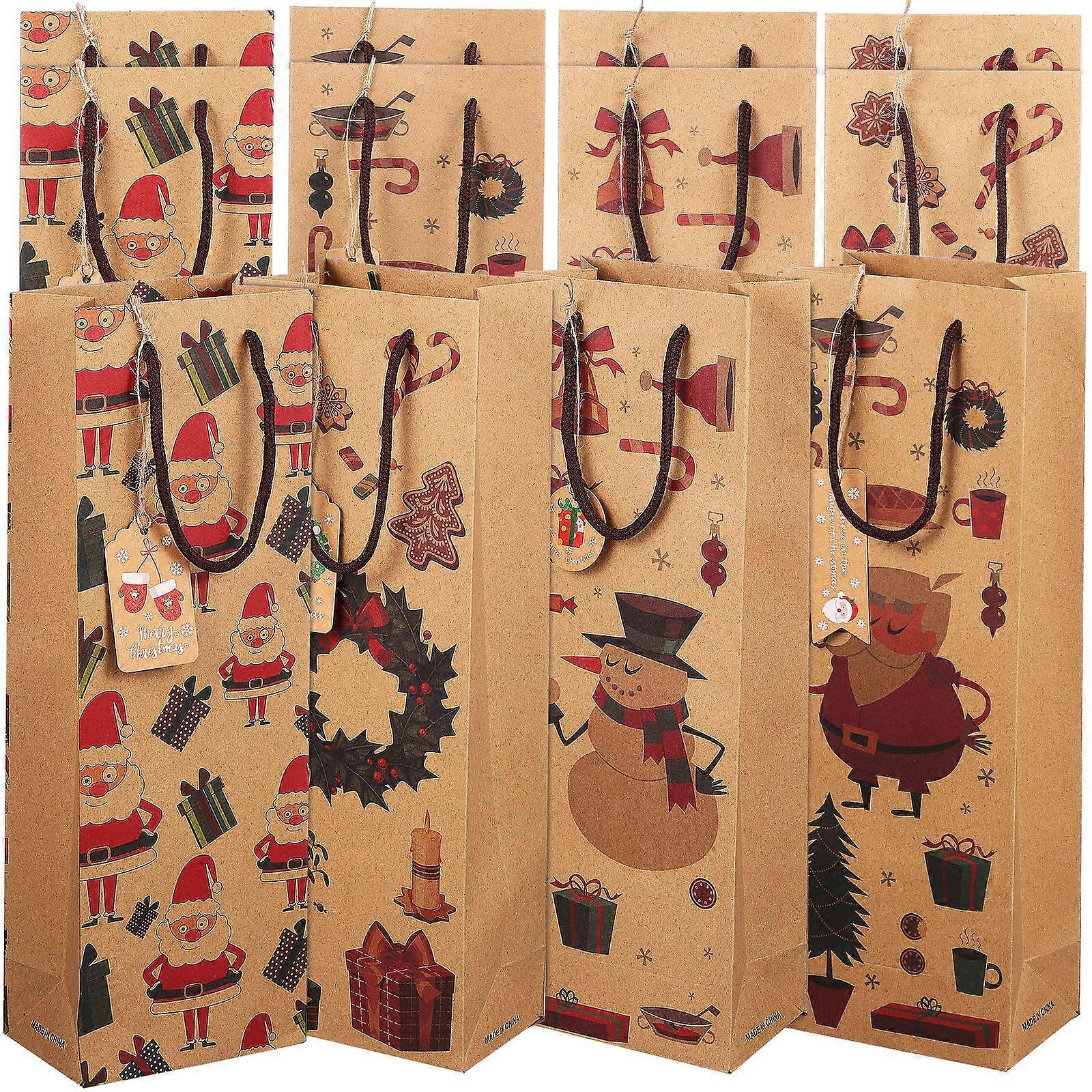 Description These wine bottle gift bags are full of Christmas elements, suitable for Christmas gifting and decorations. The bags are made from kraft paper, durable and not easy to tear off. Each bag is equipped with a handle, easy to carry. Wrap your wine with these delicate bags and have a fun Christmas time. Features -Color:As Shown -Material:Kraft paper -Size:37.00X12.50X8.00cm/14.54X4.91X3.14in - Various choices: These paper bags are designed with different patterns, offering sufficient quantity and great combination. - Festive atmosphere: These wine bags are decorated by various patterns of Christmas style, festive and exquisite. - Durable material: The bags use thicken kraft paper, no need to worry about the wine bottle dropping off. - Adorable tags: There are several tags, so you can hang them on these bags, which makes the gift more decorative and unique. - Practical wrapping bags: The paper bags are suitable for Christmas gift wrapping and giving to family and friends.Package listing: 12 x bags 10 x tags 50 x pieces of string