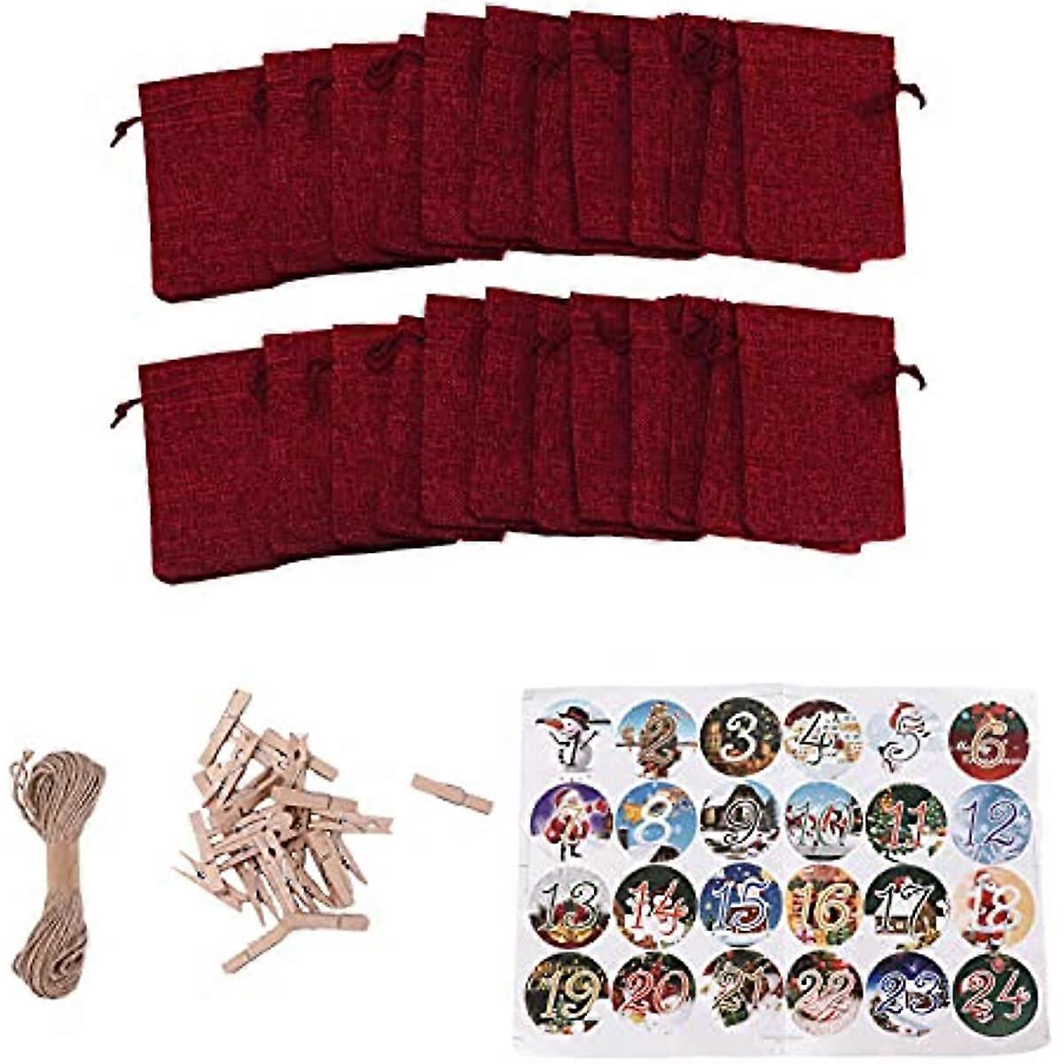 24PCS Drawstring Christmas Bag Lucky Number Gift Bag Christmas Sack Christmas Advent Calendar Pouch(Wine Red)