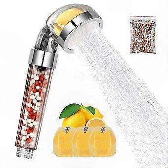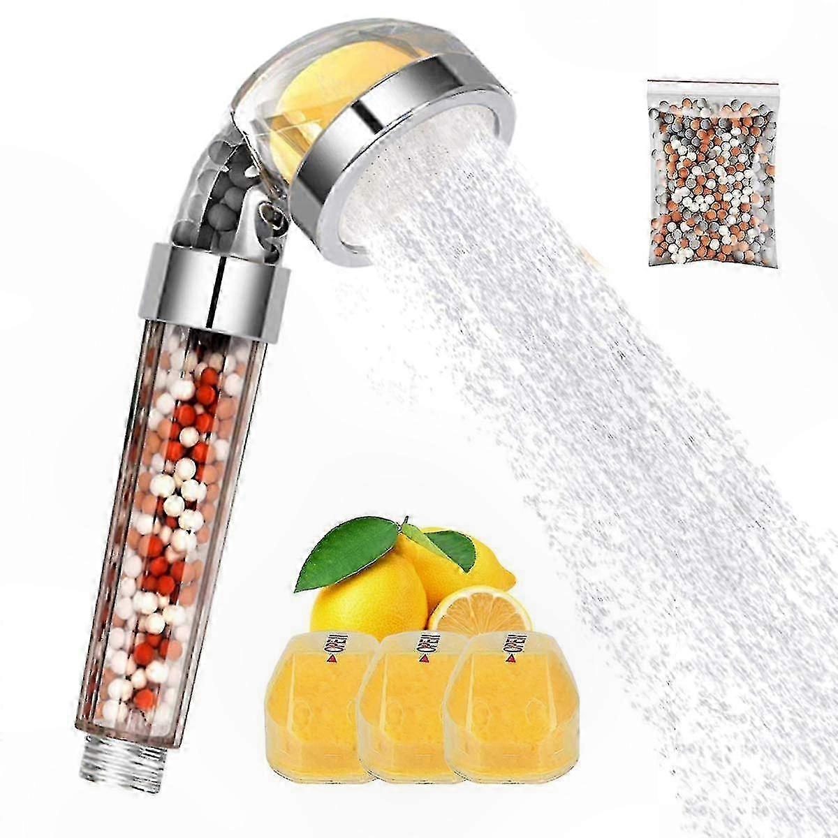 [Vitamin C Shower Head] includes 3 vitamin C (yellow) cartridges. Vitamin C helps neutralize chlorine and may support skin and hair health by reducing exposure to impurities. It can help improve water quality by reducing chlorine levels, minimizing unpleasant odors, and releasing a light citrus scent during use, which may contribute to a more refreshing shower experience. [Ionic Filter] Features 4 types of natural bioactive stones designed for effective water filtration. This multi-layer filtration system helps reduce chlorine, fluorine, heavy metals, pollutants, harmful chemicals, bacteria, pesticides, rust, and odors from the water supply. The advanced filtration helps provide cleaner, more purified water for a healthier showering experience. [High Pressure Water Saving] Equipped with a stainless steel spray plate containing 198 precision nozzles. Utilizes micro-spray technology to deliver strong water pressure while optimizing water flow. The efficient design helps reduce water usage without sacrificing performance, offering a comfortable and economical shower. [Easy to Install] Designed for simple installation—connects quickly to any standard shower arm without tools. The handheld shower is easy to assemble and disassemble for filter replacement or cleaning. Compatible with wall-mounted, fixed, and handheld setups. All connections can be secured by hand. [What You Get] 1 handheld shower head and 3 vitamin C filter cartridges. Vitamin C cartridges should be replaced every 3–6 months. Remove the protective wrapping before initial use. Customer satisfaction is our priority.