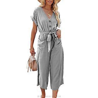 Kvinder Kortærmet V-hals Jumpsuit Afslappet Ren farve Knap Bælte Bred Bensparkedragt med lommer Grå S
