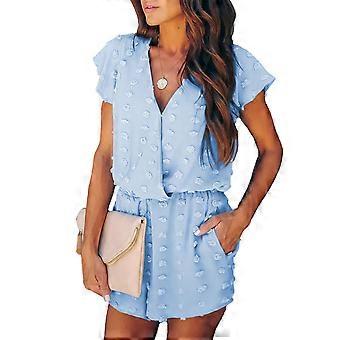 V-hals Kortærmet Romper Kvinder Sommer Løs Afslappet Ren farve Schweizisk Dot Flysedragt Med Lomme Blå L