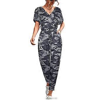 Kvinder V-hals Kortærmet Buksedragt Talje Snøre Elastisk Beskåret Niende Bukser Buksedragter Med Lommer Grå Camouflage S