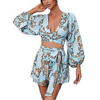 Kvinder Jumpsuit Udskæring Dyb V-hals lanterne Langærmet Bælte Shorts Slim Fit Jumpsuit Blå XXL