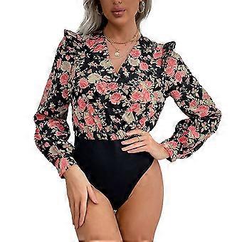 Kvinder Blomsterprint Bodysuit Elastisk Wrap V-hals Flæsetrim Ét stykke patchwork Bodycon Jumpsuit S Sort