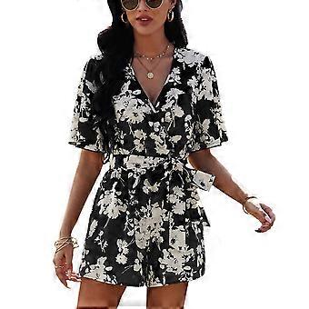 V-hals Kortærmet Romper Kvinder Stilfuld Elegant Slips Talje Blomsterprint Buksedragt Til Dating Fest Sort XL