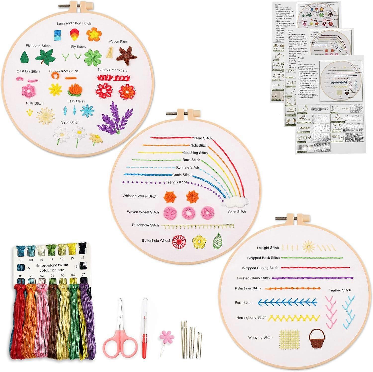 Embroidery Beginner's Stitch Practice Kit, 3 piece embroidery starter kit to learn 30 different sewing techniques
