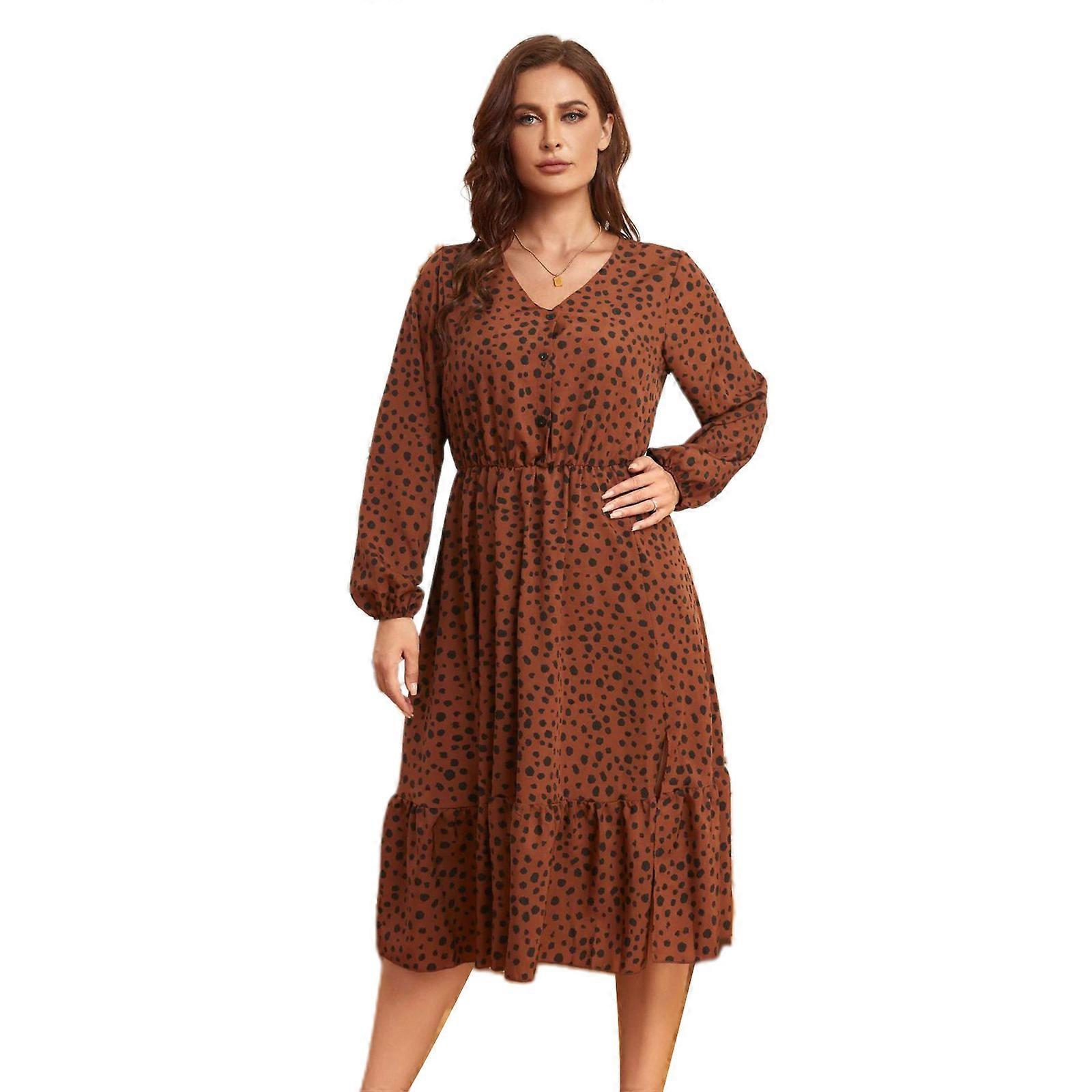 Womens Plus Size Bubble Long Sleeve V Neck Buttons Side Slit Party Midi Swing Dress Vintage Dots Print Ruffles Sundress brown XL