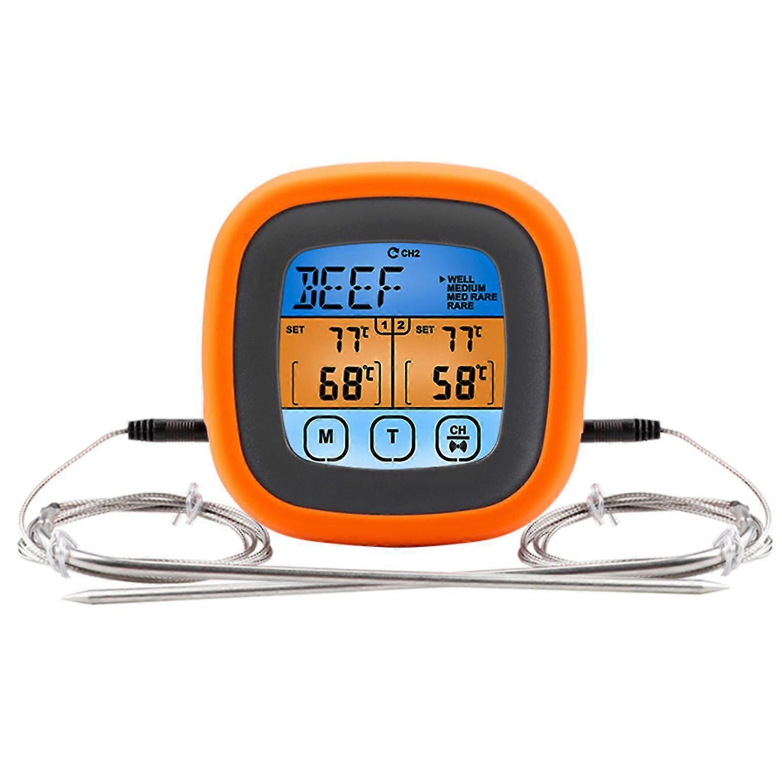 Features [Dual Probes] IP67 waterproof and 250 high temperature resistant, 2 probes can be used at the same time, suitable for different food temperature measuring needs. [Large Display Touchscreen with Backlight] Convenient for temperature setting and meat selection, easy to read even at night or in dark environment. [High Temperature Alarming] Wide temperature range -20~250, when the probe reaches its set temperature, a large sound and flashing light alarm will be given out to alert you. [Flexible to Use] 8 kinds of meat selection: beef, lamb, veal, hamburger, pork, turkey, chicken and fish; 4 taste levels for option according to your flavors; and selectable. [Base Stand & Magnetic Design] Can be easily put on the desk and attached to an oven, convenient for use; made from premium liquid silicone, impact-proof and durable. Specifications Color: Orange & black Material: Silica gel Temperature Range: -20~250 -4~482 Product Size: 8 * 8 * 3cm/ 3.1 * 3.1 * 1.1inch Product Weight: 132g/ 4.6oz Note Powered by 2 * AAA batteries (not included). The food, oven, and grill showed in the pictures are not included. Package List 1 * Meat Thermometer 2 * Probe 1 * User Manual