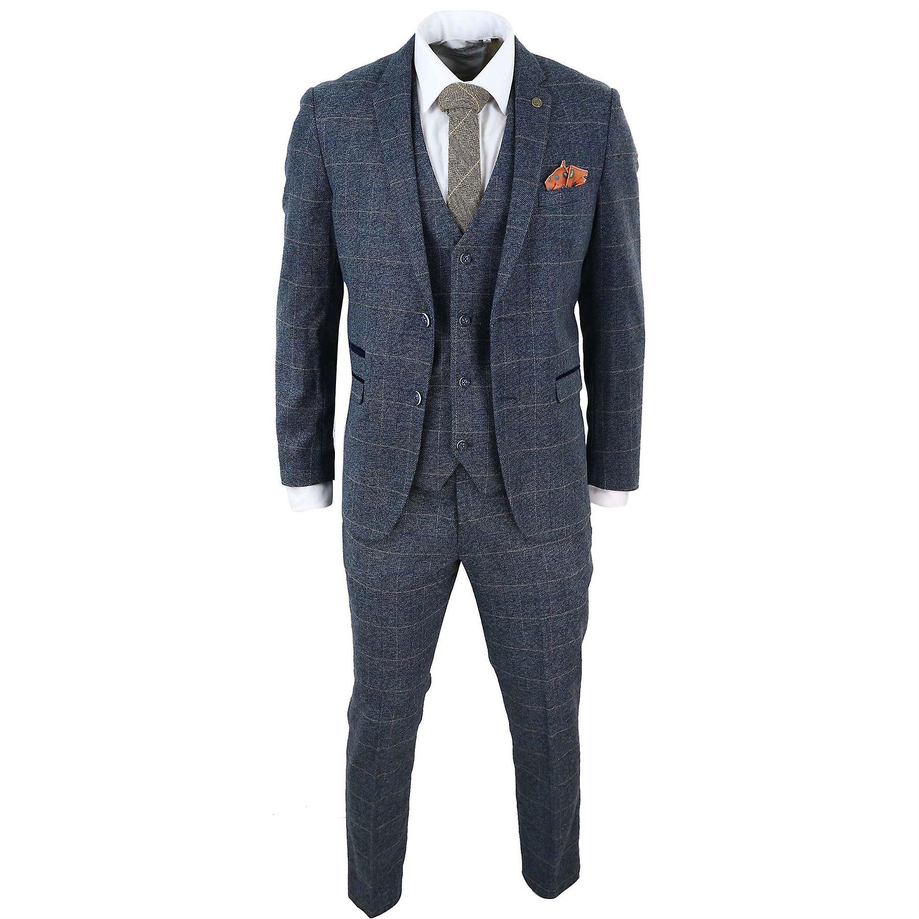 Men's Check 3 Piece Suit Herringbone Tweed Vintage Tailored Fit Velvet