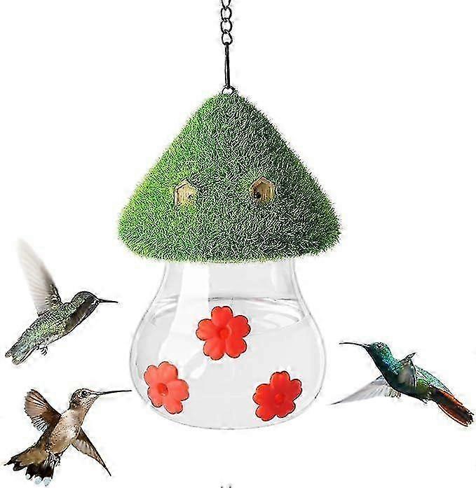 CUTE MUSHROOM SHAPE: Our hummingbird feeder comes in an attractive mushroom shape with bright colors that are sure to attract hummingbirds; this mushroom shaped water feeder meets the visual needs of bird watchers as well as hummingbird feeding needs. A great gift for bird watching enthusiasts. ATTRACT MORE BIRDS: The hummingbird feeder is designed with 3 red petal-decorated water spouts, allowing birds to see the feeder more directly and attracting more hummingbirds to drink. Makes feeding wild birds easier and more natural. APPROPRIATE CAPACITY: The hanging hummingbird water feeder measures 3.7x3.7 x 6 inches and has a capacity of approximately 10 ounces (275 ml), which ensures that hummingbirds won't run out of their favorite nectar any time soon, allowing you to enjoy more bird-watching moments and spend less time on maintenance. LEAK-PROOF AND DURABLE: The mushroom roof of the bird feeder is made of wire and flocked material for added strength, while the bird feeder container is made of clear ABS material that is protected from the weather elements, ensuring that your bird feeder retains its charm and functionality for a long time. EASY CLEANING PROCEDURE: Our small hummingbird feeder is easy to clean, just disassemble it and wash it with water, no complicated techniques or tools are needed to keep your bird feeder tidy.