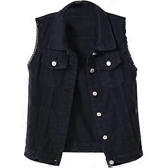 Kvinder Crop Denim Vest Jakke Ærmeløs Button Down Rippet Casual Waistcoat Jakke