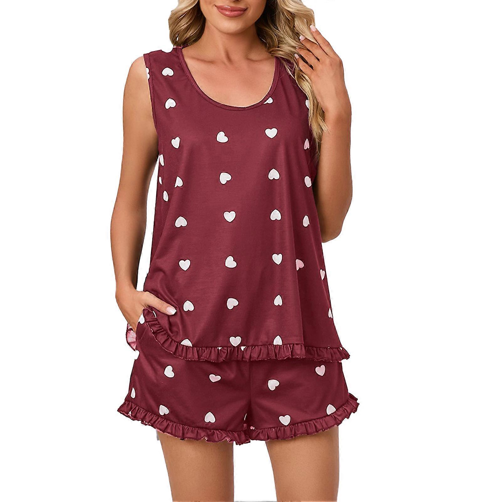 Women Heart Print Ruffle Pajamas Set Crewneck Tank Top Slant Pocket Shorts 2 Piece Sleepwear Loungewear