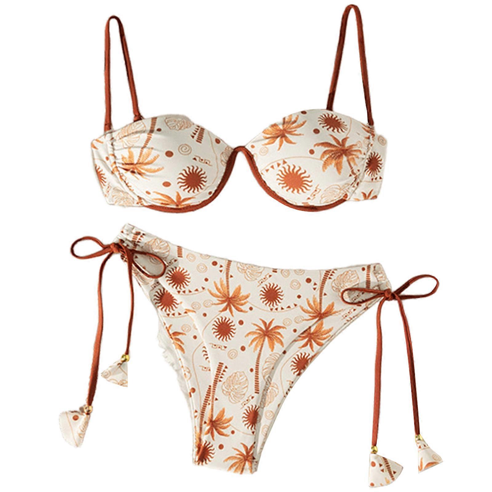 Women Backless Swimsuit Coconut Tree Print Bathing Suit Two Pcs Split Swimwear Swimming Costume Set Push Up Swimwear brown S