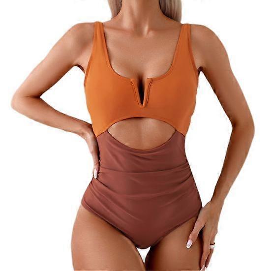 Women Sexy Monokini V-neck Sleeveless Hollow Out One-piece Swimsuit Patckwork Color Tummy Control High Waisted Bathing Suit