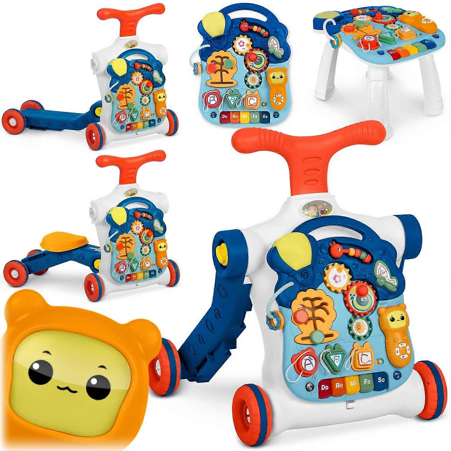 5-in-1: loopwagen, duwkar, step, speeltafel en educatief bord