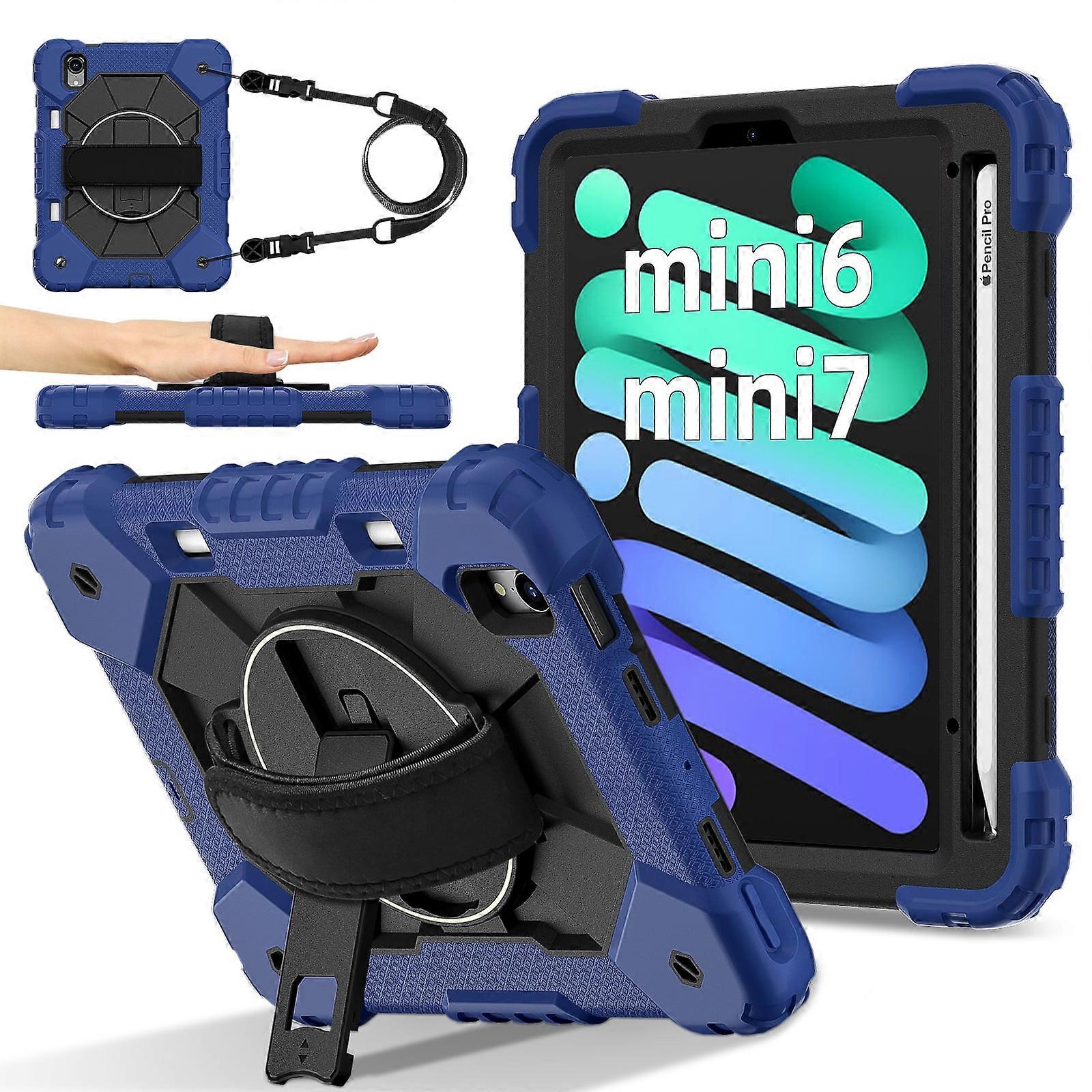 Rugged 3-Layer Shockproof Case compatible with iPad Mini 6 (2021) & Mini 7 (2024), 360 Rotating Stand, Hand Strap, Pencil Holder