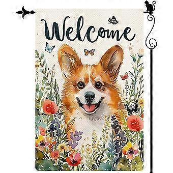Velkommen Akvarel Smilende Corgi Vilde blomster Forår Have Flag Lodret Forår Sommer Have Flag S