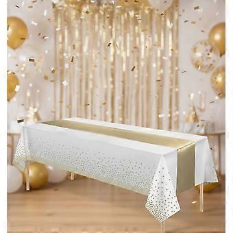 8-Pack White & Gold Dot Plastic Tablecloths + Gold Satin Runners – Wedding, Birthday, Baby Shower, Anniversary, Christmas, New Year Party Decor