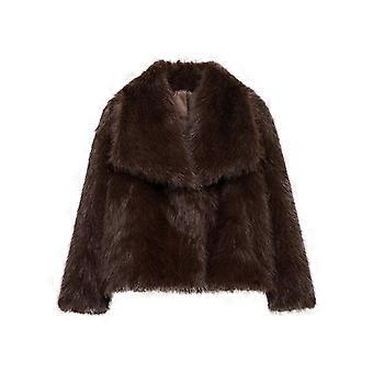 Damelang imiteret pelsfrakke med revers, shaggy vinterjakke, varm, pelset åben front overtøj
