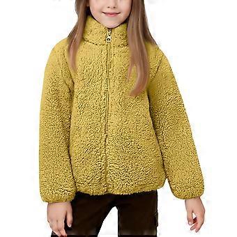 Børnejakke med lynlås og standkrave, sherpa fleecejakke med lange ærmer, blødt og plysagtigt overtøj til børn, piger, drenge, vintertøj, model #E020, gul 110
