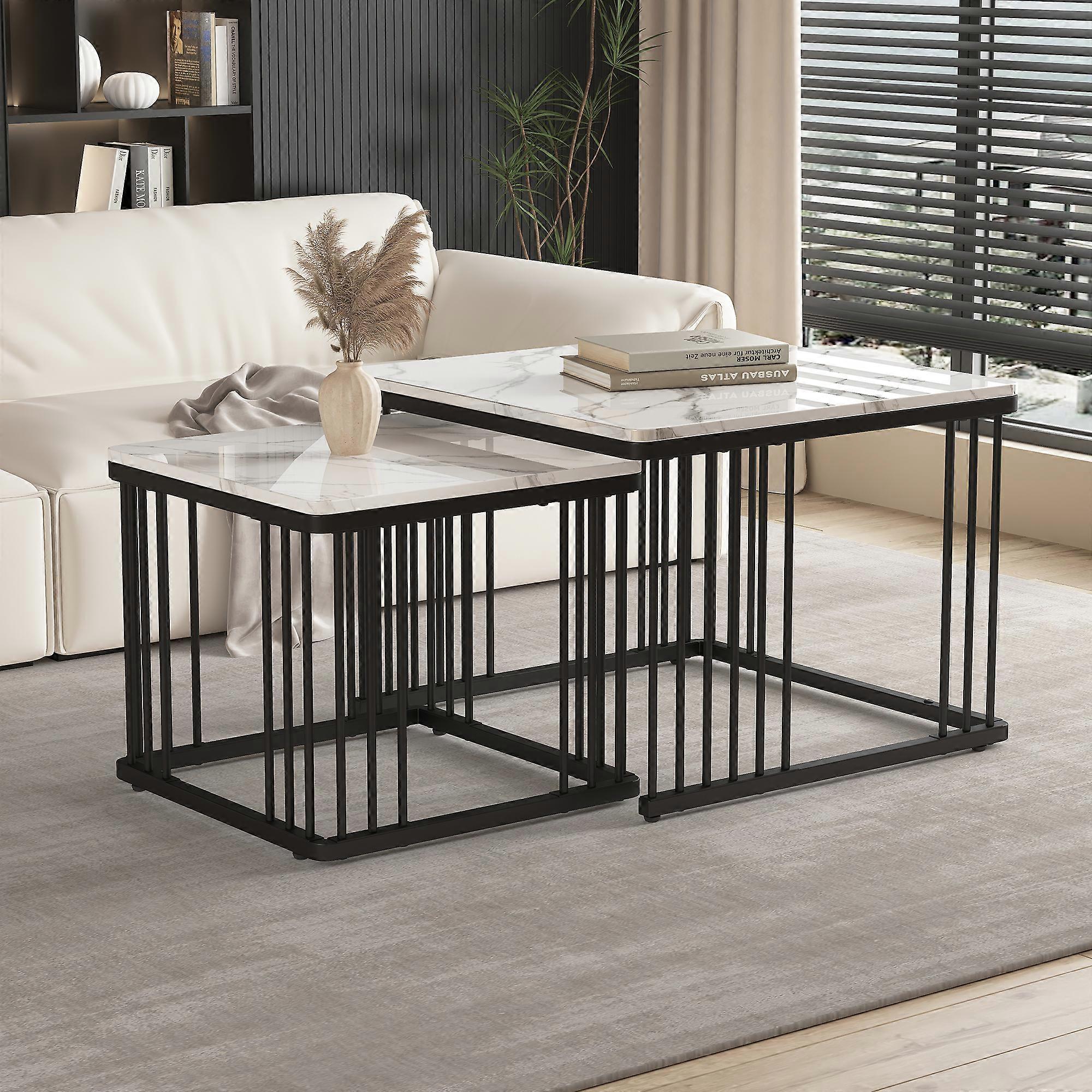 Stylish 2-Piece Square Coffee Table Set High-Gloss Marble Effect Adjustable Legs