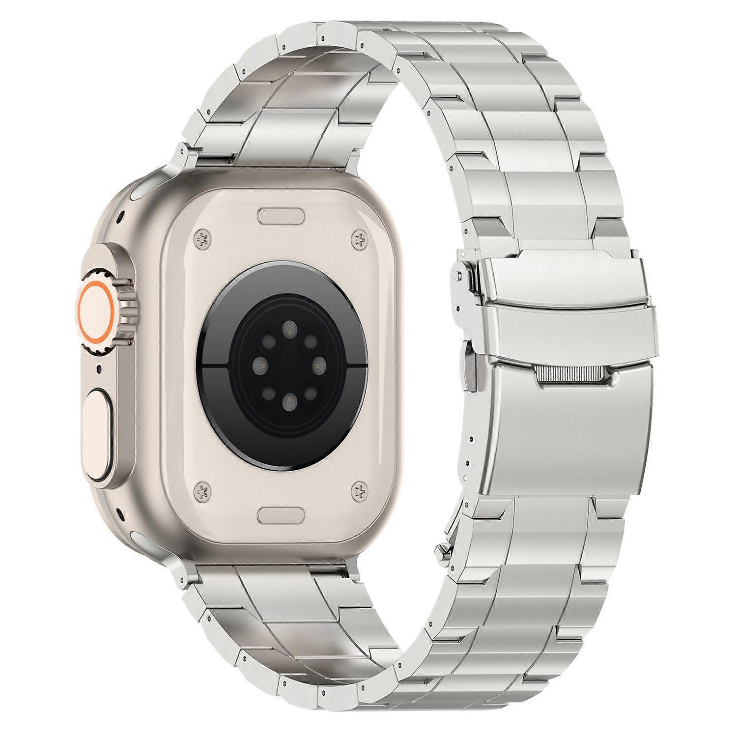 •Features a unique convex safety clasp,which provides a secure fastening mechanism •The band is composed of trapezoidal titanium steel links,offering a contemporary and stylish appearance •Crafted from high-quality titanium steel,this watch band is known for its durability and strength •The sleek design and metallic finish of the watch band make it suitable for a variety of occasions,from casual outings to formal events Specifications: •Material: Titanium steel •Size: 160mm •Applicable wrist circumference: 160-220mm Compatible with: •Apple Watch Series 1 42mm •Apple Watch Series 2 42mm •Apple Watch Series 3 42mm •Apple Watch Series 4 44mm •Apple Watch Series 5 44mm •Apple Watch Series 6 44mm •Apple Watch SE 44mm •Apple Watch Series 7 45mm •Apple Watch Ultra 49mm •Apple Watch Series 8 45mm •Apple Watch SE (2022) 44mm •Apple Watch Series 9 45mm •Apple Watch Ultra 2 49mm •Apple Watch SE (2023) 44mm •Apple Watch Series 10 46mm Package included: •1 x Watch Strap •Strap only,watch not included