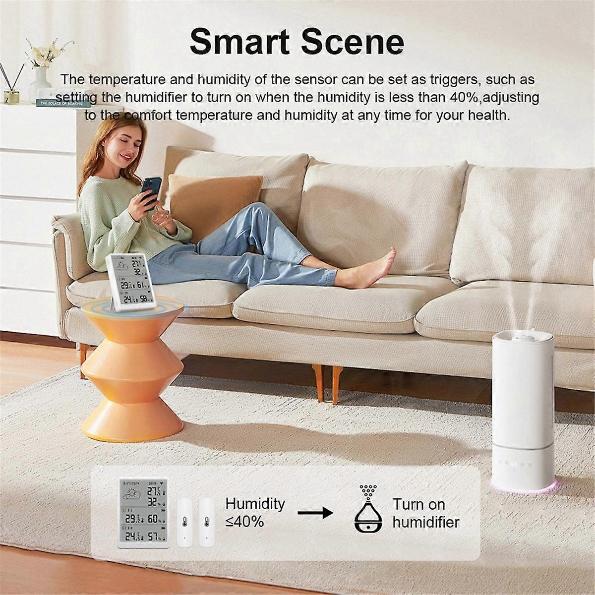 Smart WiFi temperature and humidity sensor set: 2 sub-device temperature and humidity are standard, and you can easily monitor temperature and humidity data in real time anytime and anywhere through the Tuya APP. The WiFi host can pair up to 10 sub-device sensors (5G WiFi is not supported) Alarm function: Set the preset temperature and humidity range, and when the smart hygrometer thermometer detects a reading out of range, the alarm message will remind you through the mobile phone. Respond faster to sudden changes in greenhouse, bedroom temperature, etc. Precision Sensing Technology: Equipped with advanced sensors, this monitor delivers highly accurate humidity and temperature readings. Ideal for maintaining optimal living conditions, it helps you manage environments efficiently with reliable data. Voice Command Features: Enhance your experience with voice control capabilities. Compatible with popular voice assistants, this monitor allows you to check current conditions with simple voice commands, offering convenience and accessibility. Versatile Use in Various Environments: Perfect for greenhouses, wine cellars, and more, this monitor helps you maintain ideal conditions in diverse settings. Its robust functionality makes it essential for health and comfort in specialized habitats. About update frequency - The sensor uses a trigger mechanism. When the temperature or humidity changes to the set value, the sensor will report the data immediately. Usually, the data is updated once an hour. 1. High accuracy. The sensor uses top suppliers. It can guarantee high accuracy of measured data. 2. Application monitoring and recording. The sensor will monitor the temperature and humidity in the APP. You can view the changes in values on the APP. Record temperature and humidity changes on the APP and use graphical display. 3. Scene linkage - The sensor can be used as a temperature and humidity data source for Tuya Smart, Smart Life, Amazon Alexa, and Google Home. You can perform many automated processes based on the data source. 4. Third-party voice support. The sensor supports Amazon Alexa and Google Home Assistant. You can view the current temperature and humidity by voice. After configuration, it takes 30 minutes to be accurate. Host power supply method:DC5V (Type-C) Sub-device power supply method:LR03-1.5V/2 x AAA battery(not included) Wireless type:Wi-Fi 2.4GHz/RF433 Temperature measurement range:-9.9-60 Temperature accuracy:0.6 Humidity measurement range:0%RH-100%RH Humidity accuracy:6%RH Product packaging size:13x10.5x4.7CM Product weight (one to two):185g Note:Rechargeable 1.2V battery may cause inaccurate power measurement. Colour:White Material:ABS Package Contents: 1 * Temperature Humidity Monitor 2 * Sensor 1 * USB Power Cable Only the above package content, other products are not included. Note: Light reflection and different displays may cause the color of the item in the picture a little different from the real thing. The measurement allowed error is +/- 1-3cm.