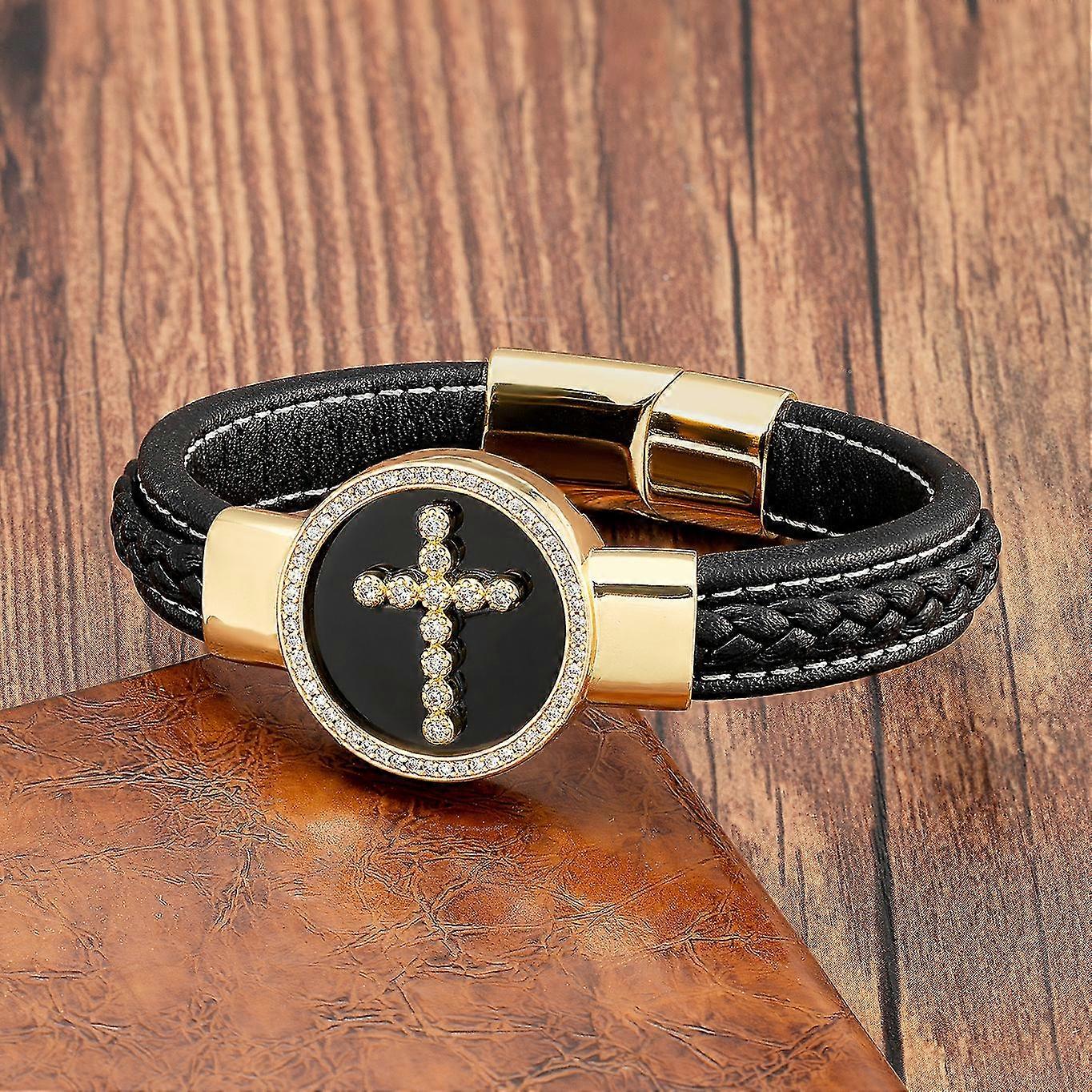 Yishucha Religious Winds Design Fashion Men's Retro Leather Bracelet Round Stone Classic Stainless Steel Gift For Men Jewelry