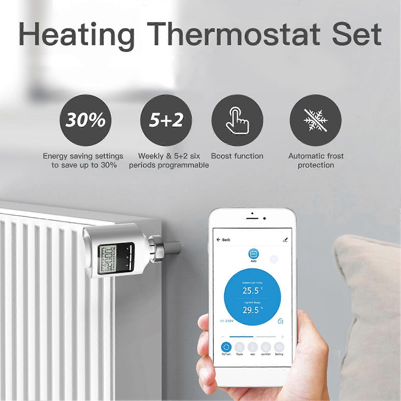 Feature:1. Tuya ZigBee Thermostatic Radiator ValveA special valve using cooperatively with heating radiator, conveniently regulate the room temperature with the ZigBee radiator thermostat. It is more stable for ZigBee Gateway\u0027s wide compatibility to connect with more smart devices and it can realize whole linkage, quite suits for villas.2. APP Control \u0026 Voice ControlIt can be controlled through SmartLife or Tuya Smart APP by your smart phone before you come back home. Hands-free voice control, compatible with Alexa and Home.3. Create Group \u0026 Smart ShareCreate the group to control all ZigBee radiator valves slected at the same time in APP. Sharing function allows you to share with family members and control together.4. 3 Operation Modes \u0026 Temperature-Rising FunctionAuto/ manual/ holiday mode for you to choose, helping you comfortably adjust the desired temperature according to different sistuations. Easily switch into different modes through a short press on mode key. Rapid temperature-rising function enables quick, short-term radiator heating, immediately bringing comfortable warmth to the room.5. Weekly ProgrammableThe default setting for each working day is 5 segments, and up to 9 segments can be set. The setting value can be selected for a certain day in a week/ workday/ weekend/ a whole week through rotary knob, meeting different requirements. And with child safety lock function for preventing children operating by mistake.6. Easy Installation \u0026 Energy-SavingComes with rich installing accessories, fits to more radiators and is easy to mount without having to drain any water or intervene in the heating system. More energy-saving, simply replace the old conventional radiator valve.7. Window-Opening FunctionWhen the temperature drops rapidly, indoor temperature drops by 5 degrees in 5 minutes, equipment will automatically determine whether window of the room should be opened for ventilation.8. Anti Freezing ModeWhen the temperature in users\u0027 rooms drop to 0, temperature controller will open the valve automatically, until the temperature rises to 5.Specification:ZigBee thermostatic radiator valve is an energy-saving thermostat for the heating radiator that is compatible with the ZigBee wireless standard. As a heating radiator thermostat, it uses the Home Automation Profile 1.2 as an HVAC compatible terminal device. It will be your best choice of temperature controlling for smart home.Features:Tuya ZigBee Thermostatic Radiator ValveA special valve using cooperatively with heating radiator, conveniently regulate the room temperature with the ZigBee radiator thermostat. It is more stable for ZigBee Gateway's wide compatibility to connect with more smart devices and it can realize whole linkage, quite suits for villas.APP Control & Voice ControlIt can be controlled through SmartLife or Tuya Smart APP by your smart phone before you come back home. Hands-free voice control, compatible with Alexa and Home.Create Group & Smart ShareCreate the group to control all ZigBee radiator valves slected at the same time in APP. Sharing function allows you to share with family members and control together.3 Operation Modes & Temperature-Rising FunctionAuto/ manual/ holiday mode for you to choose, helping you comfortably adjust the desired temperature according to different sistuations. Easily switch into different modes through a short press on mode key. Rapid temperature-rising function enables quick, short-term radiator heating, immediately bringing comfortable warmth to the room.Weekly ProgrammableThe default setting for each working day is 5 segments, and up to 9 segments can be set. The setting value can be selected for a certain day in a week/ workday/ weekend/ a whole week through rotary knob, meeting different requirements. And with child safety lock function for preventing children operating by mistake.Easy Installation & Energy-SavingComes with rich installing accessories, fits to more radiators and is easy to mount without having to drain any water or intervene in the heating system. More energy-saving, simply replace the old conventional radiator valve.Window-Opening FunctionWhen the temperature drops rapidly, indoor temperature drops by 5 degrees in 5 minutes, equipment will automatically determine whether window of the room should be opened for ventilation.Anti Freezing ModeWhen the temperature in users' rooms drop to 0, temperature controller will open the valve automatically, until the temperature rises to 5.Connecting Device:* Make sure the smart phone is connected to Wi-Fi 2.4GHz router before connecting the heating radiator thermostat1. Download SmartLife or Tuya Smart APP2. Install the Tuya ZigBee gateway (purchase separetly)3. Open the APP, enter the ZigBee gateway main menu and add device according to user manualNote:1. Only operate the device in inside rooms and avoid the influence of moisture, dust and sunlight or external heat radiation.2. Do not allow ch